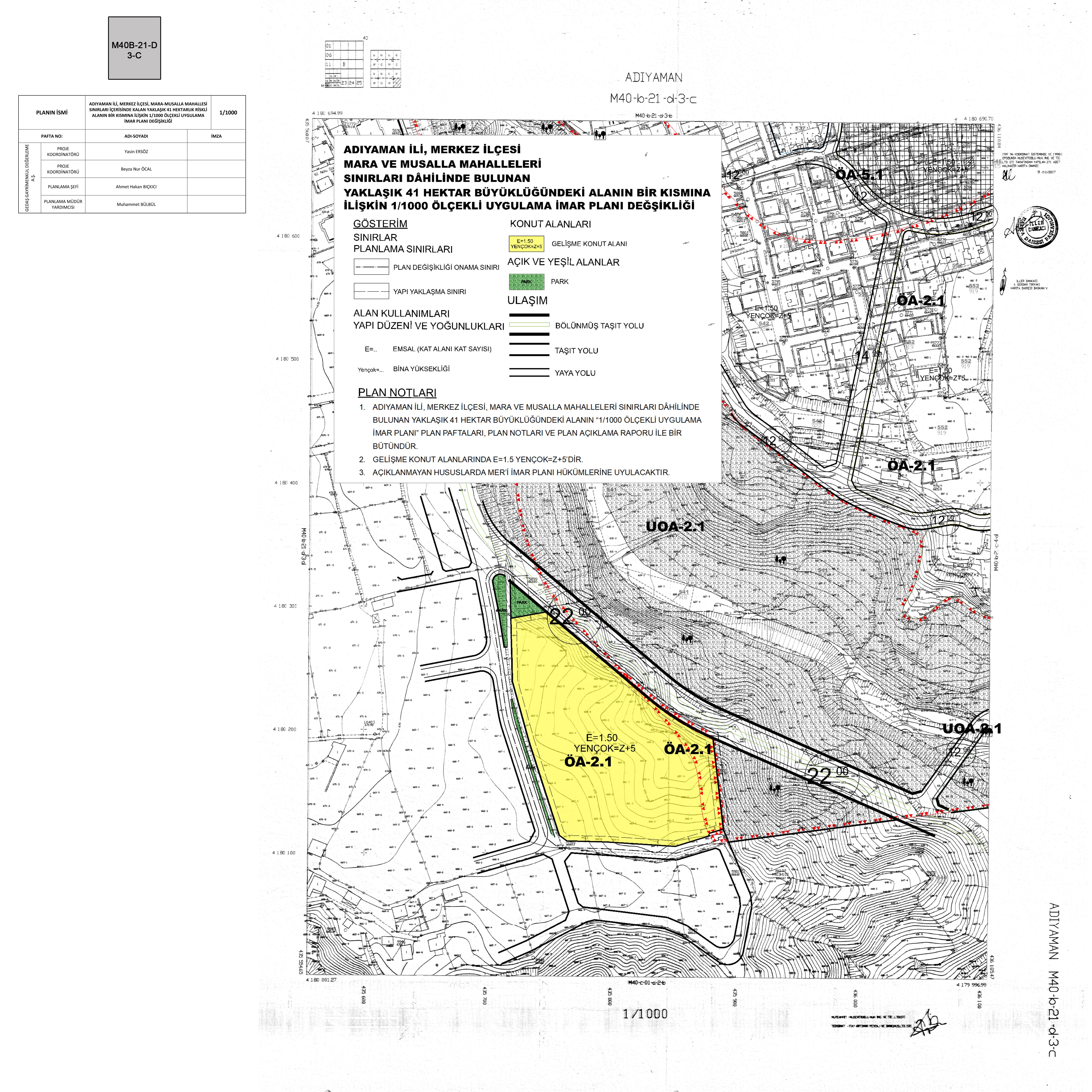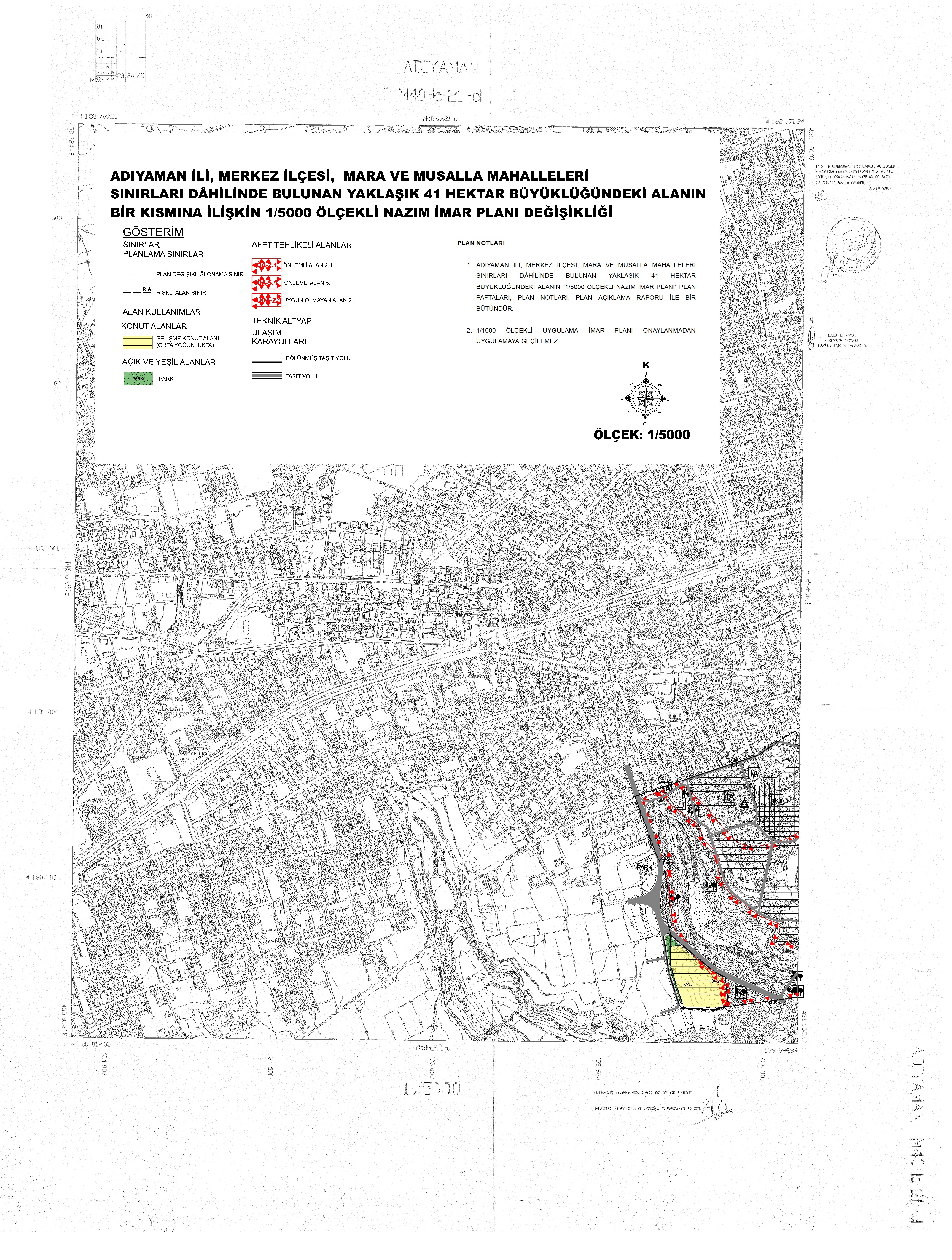 6306 sayılı Afet Riski Altındaki Alanların Dönüştürülmesi Hakkında Kanun Kapsamında 2015/7940 sayılı Bakanlar Kurulu Kararına istinaden 09.08.2015 tarih ve 29440 sayılı Resmi Gazetede yayımlanarak ‘’Riskli Alan’’ ilan edilen Adıyaman İli, Merkez İlçesi, Mara-Musalla Mahallesinde Riskli Alanın 2.29 Hektarlık Kısmına İlişkin 1/5.000 ölçekli Nazım İmar Planı Değişikliği ve 1/1.000 ölçekli Uygulama İmar Planı Değişikliği 6306 sayılı Afet Riski Altındaki Alanların Dönüştürülmesi Hakkında Kanunu’nun 6. maddesi uyarınca Bakanlığımızca onaylanmıştır.